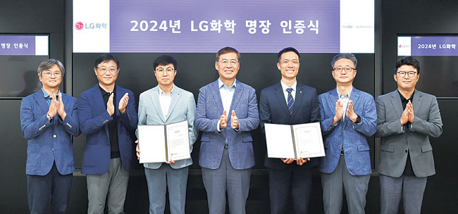 LG화학은 서울 영등포구 LG트윈타워에서 신학철(사진 왼쪽 네 번째) 대표이사 부회장 등이 참석한 가운데 ‘LG화학 명장’ 인증식을 전날 진행했다고 24일 밝혔다. LG화학은 앞서 지난 2022년 현장 기술 인력이 개인 역량을 공식적으로 인정받고, 지속해서 성장할 기회를 가질 수 있도록 ‘LG화학 명장’과 ‘LG화학 전문가’ 제도를 도입한 바 있다.