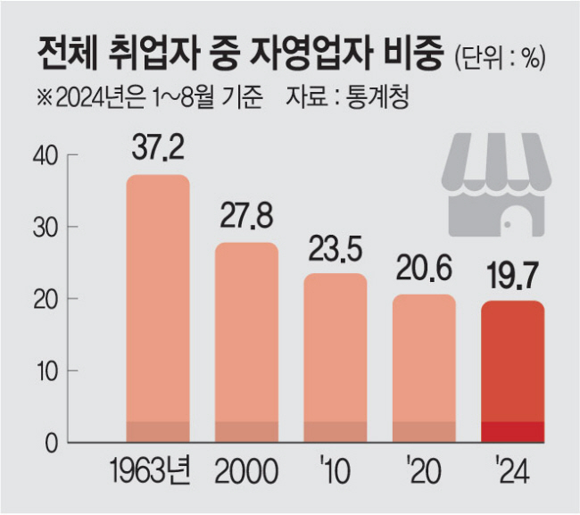 30일 통계청에 따르면 올해 자영업자는 563만6000명으로 취업자(2854만4000명)의 19.7% 수준이다. 올해 수치는 1∼8월 월평균 기준이다. 아직 올해가 4개월 남았지만, 노동시장의 큰 변화가 없다면 연간 비중 20% 붕괴는 기정사실로 보인다. 자영업자 비중은 1963년 37.2%에서 계속 하향곡선을 그려 1989년(28.8%) 30% 선이 무너졌고 지난해에는 20.0%로 가까스로 20% 선을 지켰다. 무급가족종사자는 88만2000명으로 전체 취업자의 3.1%다. 무급가족종사자는 임금을 받지 않고 자영업자의 사업체 등에서 일하는 가족·친척을 말한다.