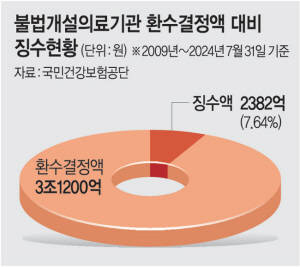4일 건보공단에 따르면 2009년부터 올해 7월까지 적발된 불법 의료기관은 1725곳에 달했다. 이들 기관이 토해내야 할 돈은 3조1200억 원에 달하지만 징수된 금액은 2382억 원(7.64%)에 그쳤다. 한 해 2000억 원씩 건보 재정 누수가 발생한 셈이다. 징수율은 매년 10%를 밑돌고 있다. 환수실적이 저조한 것은 사무장병원이나 면대약국이 재산을 빠르게 은닉하거나 증거를 인멸하는 데 비해 적발·수사에는 긴 시간이 소요되기 때문이다.