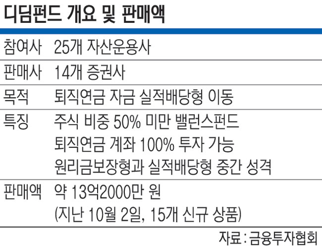4일 금융투자협회에 따르면 삼성·미래에셋·한국투자·KB 등 15개 운용사가 지난달 25일 신규 출시한 디딤펀드의 설정액(가입 금액)은 지난 2일 기준 고작 13억1900만 원으로 집계됐다. 펀드당 설정액이 100만~5억 원에 그쳐, 상장지수펀드(ETF)가 출시 첫날에만 300억 원이 넘는 가입액이 몰렸던 것과 큰 차이를 보이고 있다. 디딤펀드는 퇴직연금 활성화를 통한 국민 자산형성이란 목적으로 금투협과 25개 운용사가 지난해부터 기획했다. 주식·채권 등으로 투자 자산을 다양화해 장기간 안정적인 수익을 추구하는 ‘밸런스펀드(BF)’ 유형의 연금 특화 상품으로 주식 비중을 50%보다 낮게 설정해 퇴직연금 계좌에서 100% 한도로 투자할 수 있다는 게 장점이다.