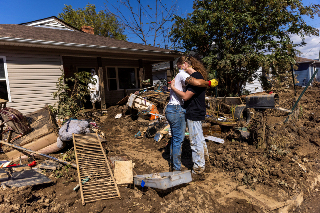 7일 허리케인 헐린이 강타한 미국 노스캐롤라이나주 스와나노아에서 한 집주인이 황폐해진 집 주변 정리를 도와주던 자원봉사자를 껴안고 고마움을 표시하고 있다.