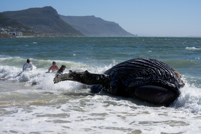 남아공 해변 ‘떠밀려온 혹등고래 사체’