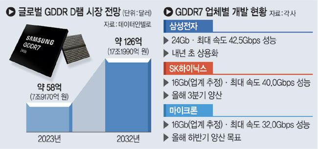 시장조사기관 데이터인텔로에 따르면, 글로벌 GDDR 시장 규모는 2023년 약 58억 달러(7조9170억 원)에서 2032년 약 126억 달러(17조1990억 원)에 이르며 연평균 9.1%의 높은 성장률을 보일 것으로 전망됐다. 게임 기술의 발전 외에도 AI향 데이터센터 확대가 주요 성장 요인으로 꼽힌다. 실제로 GDDR은 하이엔드용을 제외한 AI 서버에 활용되는데, 캐나다 AI 반도체 스타트업 텐스토렌트가 최근 자사 가속기 웜홀을 공개하면서 HBM 대신 GDDR(6세대)을 사용해 업계 주목을 받았다. 배용철 삼성전자 메모리사업부 상품기획실 부사장은 “AI 시장의 빠른 성장에 발맞춰 고용량·고성능 제품을 선보이며 시장을 선도해 나갈 것”이라고 말했다.