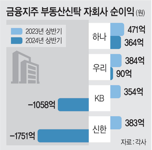KB·신한 등 금융지주사들이 부동산 프로젝트파이낸싱(PF) 부실로 경영에 어려움을 겪는 부동산신탁 자회사에 올해 들어 7600억 원 규모의 자금을 수혈했거나 투자 예정인 것으로 확인됐다. 이들 신탁사는 코로나19로 부동산이 활황기인 시절 ‘책임준공형 관리형 토지신탁(책준형 신탁)’을 통해 문어발식 부동산 투자에 나섰는데 이후 시공사들이 어려워지면서 시공사를 대신해 부실을 떠안게 돼 재무 상황이 나빠졌다. 부실 규모가 심상치 않자 금융감독원도 이들 신탁사가 사업성이 낮은 사업장까지 무리하게 투자에 나서지 않았는지 점검에 나섰다.