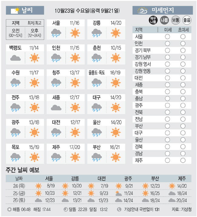 [날씨이야기] 10월23일 수요일(음력 9월21일)