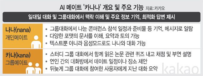 세부적으로는 개인메이트 ‘나나’(nana)와 그룹메이트 ‘카나’(kana)로 구현된다. 나나는 나와의 대화부터 그룹대화를 기억해 최적화된 개인화 경험을 제공한다. 예컨대 그룹대화에서 나눈 콘퍼런스 참석 일정과 준비물 등을 기억해 이를 잊지 않도록 내게 개인메시지로 알려주는 식이다. 다양한 포맷의 문서를 이해하는 만큼 그에 대한 요약과 토의도 가능하다.