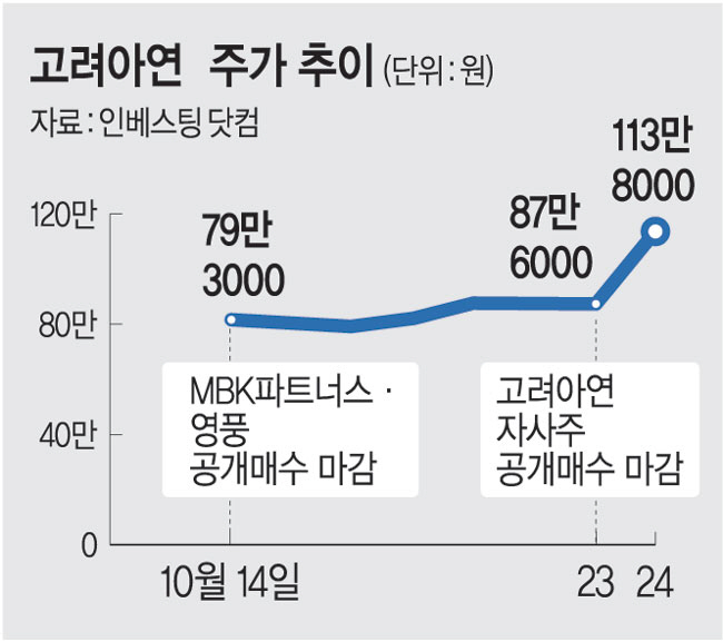 고려아연 경영권을 두고 최윤범 회장 측과 MBK파트너스·영풍 연합 간의 경쟁이 장기화할 것이라는 전망 속에 고려아연 주가가 24일 장중 상한가를 기록했다. 양측 모두 과반 지분을 확보하지 못하면서 남은 유통 주식을 차지하려는 지분 경쟁이 치열할 것이란 투자자 기대감이 반영된 영향으로 분석된다.