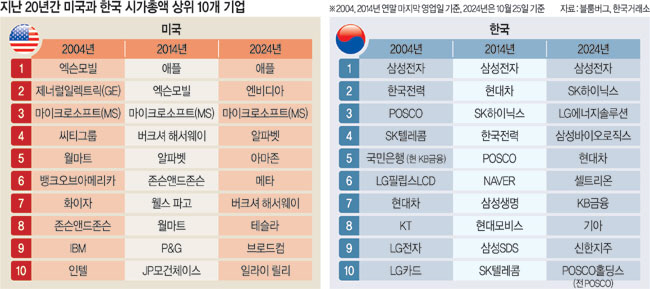 미국은 2004~2014년 구글의 모회사인 알파벳을 비롯해 2015~2024년(10월 말) 엔비디아·아마존·메타(옛 페이스북)·테슬라 등이 당당히 시가총액 상위 10위권 내에 이름을 올렸다. 마이크로소프트(MS), 아마존 등 ‘공룡 기업’들도 클라우드란 신규 산업 모델로 탈바꿈하며 경쟁에 나서고 있다. 특히 MS는 지난 2014년 사티아 나델라를 신규 CEO로 선임해 대규모 조직 개편도 실시했다. 지난 1876년에 설립된 일라이 릴리는 ‘비만약’을 선보이고 있다. 92년간 다우존스30산업평균지수 터줏대감이자 지난 2012년까지 미국 시가총액 1위를 기록했던 엑슨모빌이 지난 2020년 다우지수에서 퇴출당한 것도 놀라운 일이 아니다. 일각에서는 국내 증시에 진출하는 기업들의 혁신성이 더 지켜지기 위해서는 기업공개(IPO)문화가 개선돼야 한다는 지적도 제기된다.