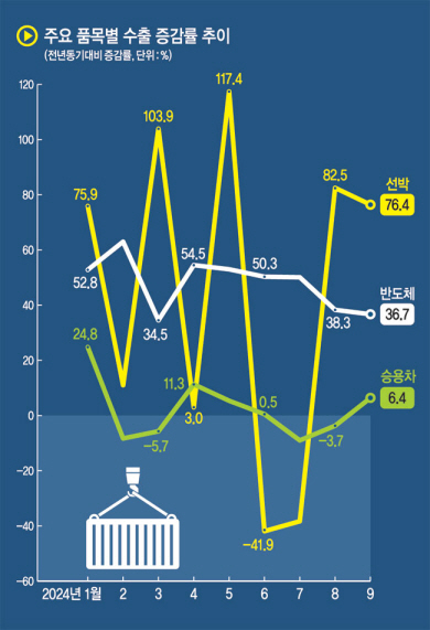 31일 관세청 및 산업통상자원부 자료를 종합하면 지난 9월 말 기준 한국의 수출 성적표는 12개월 연속 수출 증가, 16개월 연속 무역수지 흑자로 요약된다. 수출증가율은 지난해 9월(-4.4%), 마지막 역성장을 기록한 이후 올해 9월까지 내내 플러스 성장을 이어왔다. 올해만 놓고 보면 9월 말까지 평균 수출액 증가율은 9.6%로, 주요 수출국 가운데 최상위 수치다.