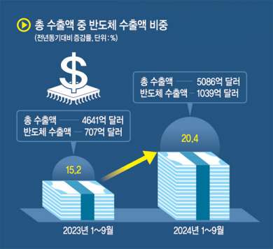 올해 반도체 수출 증가율은 1∼9월 기준 평균 46.9%다. 수출액 기준으로 전년 1∼9월 707억3000만 달러에서 올해 같은 기간 1039억400만 달러로 늘었다. 전체 수출 대비 반도체 비중은 지난해 1∼9월 15.2%에서 올해 같은 기간에는 20.4%로 늘었다. 특히 올해 1∼9월 반도체 수출 증가액 332억 달러는 같은 기간 전체 수출 증가액 445억 달러의 74.6%, 무역흑자 368억 달러의 90.2%를 차지한다.