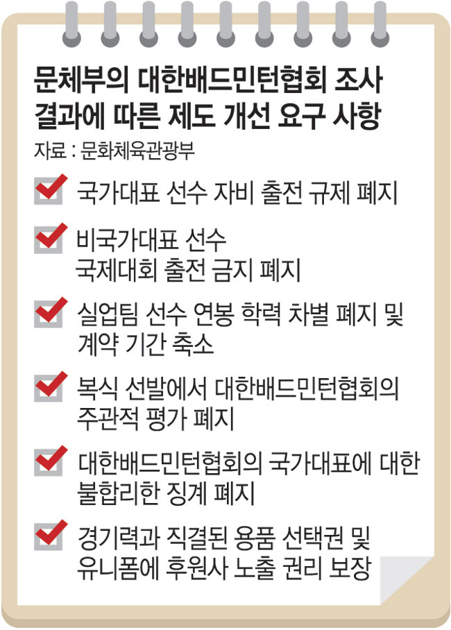 문체부는 국제대회에 출전하는 국가대표의 자비 출전, 비국가대표의 국제대회 출전 금지 폐지, 경기력과 직결된 용품 선택권, 선수의 후원사 로고 노출 권리 보장, 실업팀 선수의 연봉 학력 차별 폐지, 불합리한 징계 규정 폐지를 요청했다. 이어 재활과 치료에 대한 선수의 선택권 보장, 외출·외박 보장, 부조리 문화 근절, 새벽·산악 훈련 자율화, 지도자 증원, 개인 트레이너 참여, 1진 선수 혹사 예방 및 2진 기회 확대, 선수단 의견 청취 의무화 등을 요구했다. 이 국장은 “국가대표 선수 51명 중 36명의 개별 의견을 청취했고, 국가대표 선수들이 대부분 안세영 선수와 같은 생각을 하고 있었다”고 설명했다.