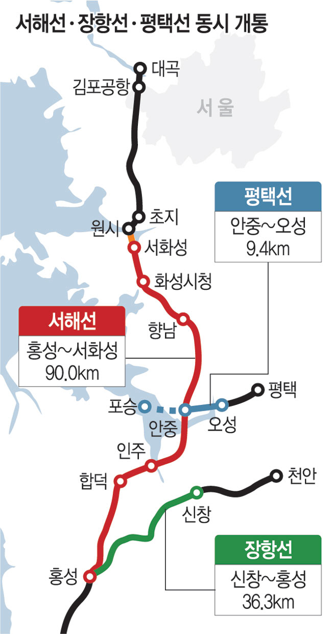 국토교통부는 서해선(홍성∼서화성), 장항선(신창∼홍성), 포승∼평택선(안중∼평택) 3개 노선이 2일 동시 개통한다고 1일 밝혔다. 이번 노선 개통으로 서해안 항만과 내륙을 잇는 화물 철도망의 기능이 확충돼 서해안 권역의 성장을 촉진할 원동력이 될 것으로 국토부는 기대했다.
