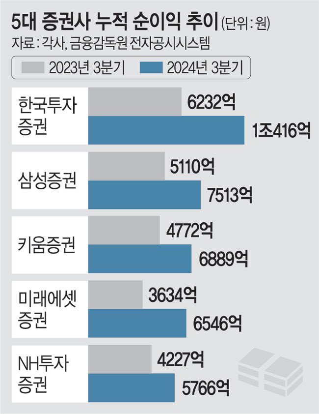 11일 증권업계에 따르면 한국투자증권·삼성증권·미래에셋증권·NH투자증권·키움증권 등 국내 주요 5개 증권사의 올해 3분기 누적 당기 순이익(지배주주지분 기준)은 총 3조7130억 원으로 전년 동기(2조3975억 원) 대비 54.8% 증가한 것으로 집계됐다. 증권사별로는 한국투자증권이 지난 3분기까지 누적 1조416억 원을 벌어들여 일찌감치 ‘1조 클럽’에 들어선 가운데 삼성증권(7513억 원), 키움증권(6889억 원), 미래에셋증권(6546억 원), NH투자증권(5766억 원) 순으로 호실적을 기록했다.