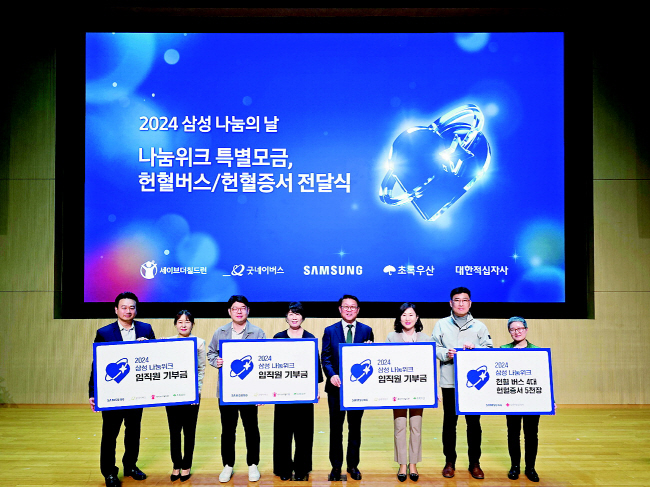삼성은 경기 수원시 삼성전자 본사에서 2주간의 봉사활동을 결산하는 ‘2024 나눔의 날’ 행사(사진)를 전날 열었다고 14일 밝혔다. 임직원들은 사원증을 대면 1000원씩 모이는 기기를 통해 총 3억5000만 원을 모았다. 성금은 희소 질환과 장애 아동들에게 전달된다. 결산 결과, 수백 개의 자원봉사팀은 국내 각 사업장 주변의 복지시설, 아동지원센터를 찾아 이불 세탁, 교육 봉사, 진로 멘토링 등 다양한 활동을 진행했다.헌혈에는 4000여 명이 참여했다. 임원들의 기부금으로 제작한 헌혈 버스 4대와 헌혈 증서 5000장도 대한적십자사에 전달됐다.
