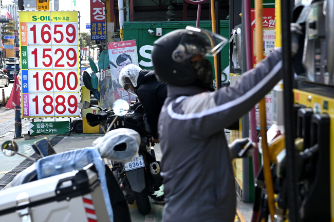 전국 휘발유와 경유 판매 가격이 5주 연속 상승한 가운데, 17일 서울 시내 한 주유소에서 오토바이 운전자들이 주유를 하고 있다.