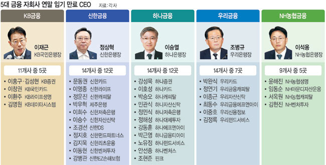 다음 주 KB국민은행장 후보 추천을 시작으로 금융권의 연말 CEO 인사 시즌이 본격 시작된다. 5대 금융그룹에서 은행과 증권, 보험, 카드 등 자회사 62곳의 CEO 중 66.1%에 달하는 41곳의 CEO가 올해 말~내년 초 임기 만료를 앞뒀다. 지난해와 달리 올해는 그룹별로 안정보다는 쇄신의 폭을 확대해 대대적인 혁신에 돌입하고 실적 개선 등을 이뤄내겠다는 분위기가 뚜렷하다.