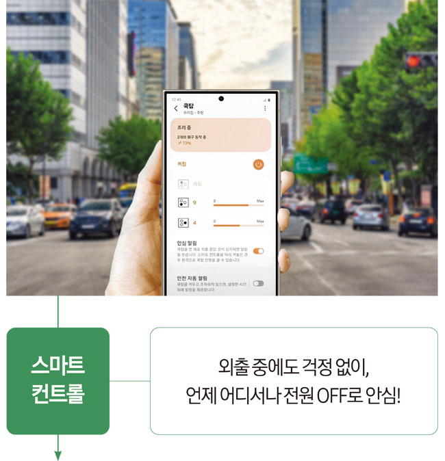 ◇외출 중에도 걱정 없이, 언제·어디서나 전원 오프(OFF)로 안심 보장! ‘스마트 컨트롤’ = 누구나 한 번쯤 외출 중 가스레인지 불 또는 인덕션 전원을 껐는지 걱정하며 분주히 집에 복귀하거나, 실제로 켜놓은 상태로 둬 냄비를 태운 경험이 있을 것이다. 특히 어린아이나 반려동물이 있는 가정이라면, 무심코 화구를 만질 위험이 있어 불안감이 한층 가중된다.