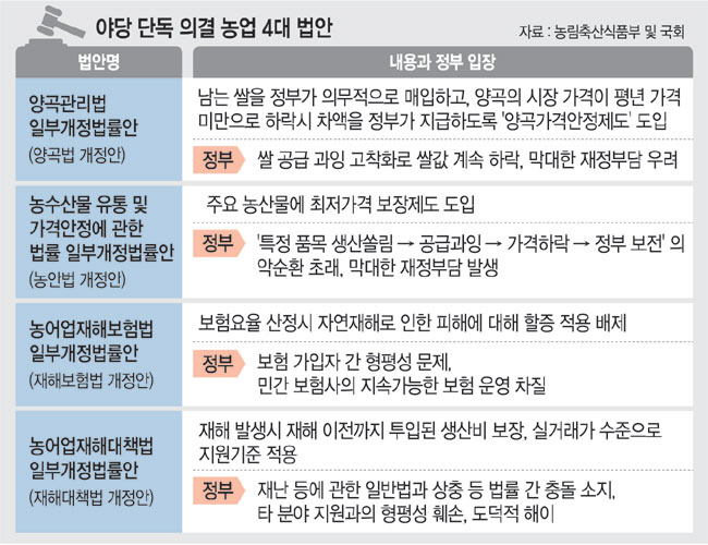정부가 지난달 햅쌀 20만t 매수와 벼 매입 자금 확대 등의 대책을 내놓은 뒤 15일 기준 산지 쌀값은 한 가마(80㎏)에 18만2872원으로 직전 조사일인 5일 대비 0.1% 상승 반전하며 하락세를 멈췄다. ‘농수산물 유통 및 가격안정에 관한 법률 일부개정법률안’(농안법 개정안) 역시 양곡법처럼 주요 농산물에 대한 최저가격 보장제 도입을 뼈대로 한다.