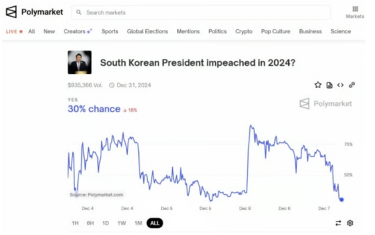 7일 오후 1시 30분 기준 가상화폐 기반의 베팅 사이트인 폴리마켓에 따르면 윤석열 대통령이 2024년에 탄핵될 확률은 30%로 나타났다. 한동훈 국민의힘 대표가 탄핵 찬성으로 입장을 선회하면서 탄핵 확률은 최고 91%까지 급등했지만 확률은 급격히 떨어졌다.