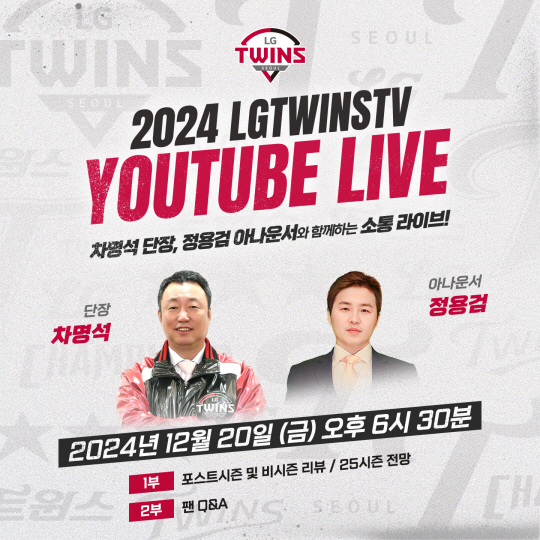 LG 구단은 "이번 라이브 방송은 1부와 2부로 나누어 열린다. 1부에서는 2024 포스트시즌 및 비시즌 리뷰와 2025시즌 전망을 다룬다. 2부에서는 사전에 받은 질문과 실시간 채팅을 통해 들어오는 팬들의 질문에 답하는 시간을 가진다"고 전했다.