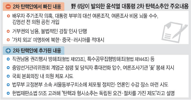 야 6당은 1차 탄핵안의 결론 부분에 나왔던 ‘배우자 주가조작 의혹’ ‘대통령 부부 대선 여론조작’ ‘여론조사 비용 뇌물 수수’ ‘김영선 전 의원 공천 개입’ 등을 모두 삭제했다. 비상계엄 사태의 위헌성만으로 충분한 대통령 파면 사유가 된다는 자신감이 읽히는 대목이다. 전문가들이 탄핵 사유와 무관하다고 지적한 ‘가치 외교’ 내용도 빠졌다. 1차 탄핵안에는 ‘가치 외교라는 미명하에 북한·중국·러시아를 적대시하는 등 동북아에서 고립을 자초하고 전쟁 위기를 촉발해 국민 보호의무를 내팽개쳤다’는 내용이 담겨 있었다.