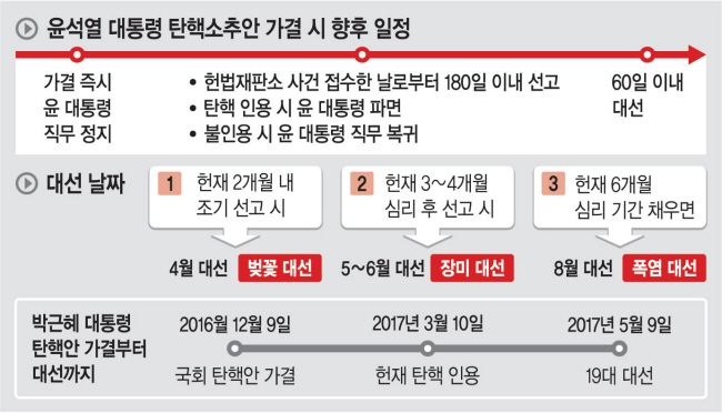 14일 국회 본회의에서 윤석열 대통령 탄핵소추안이 가결된다면 헌법재판소는 사건 접수 이후 180일 이내에 선고를 내려야 한다. 헌재가 탄핵안을 인용할 경우 60일 이내에 대선을 해 이론적으로는 내년에 ‘벚꽃 대선(4월)’과 ‘장미 대선(5∼6월)’ ‘폭염 대선(8월)’이 모두 가능한 상황이다. 다만 정치권에서는 비상계엄 사태의 명확성과 대통령 몫 헌재 재판관 퇴임 일정 등을 감안할 때 내년 6월 이내에 대선이 진행될 가능성이 크다고 보고 있다.