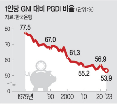 국민총소득(GNI)에서 가계총처분가능소득(PGDI)이 차지하는 비중이 지난해 53.9%를 기록하며 역대 최저 수준으로 떨어졌다. 국민소득에서 기업과 정부 몫이 커지면서 가계에 돌아가는 비중이 축소되고 있는 것으로 풀이된다. 지난해 1인당 GNI는 3만6000달러대에 진입했지만 1%대 저성장과 고환율이 고착화하며 4만 달러 진입 시기가 늦춰지는 게 아니냐는 관측이 나온다.