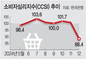 24일 한국은행이 발표한 소비자동향조사 결과에 따르면 소비자들의 경제 상황에 대한 심리를 종합적으로 나타내는 소비자심리지수(CCSI)는 12월 중 88.4로 전월 대비 12.3포인트 하락했다. 이달 낙폭은 팬데믹 때인 2020년 3월(-18.3포인트) 이후 가장 낮은 수준이다. 지수 수준 자체는 2022년 11월(86.6) 이후 최저치다. 또 CCSI가 100을 밑돈 것은 지난 5월(98.4) 이후 7개월 만이다. 이는 이달 초 비상계엄 사태 이후 정치적 불확실성과 금융시장 변동성이 확대된 데 따른 것으로 풀이된다. 황희진 한은 통계조사팀장은 “11월 미국 대선 결과에 따른 우리나라 수출 둔화 우려에 더해 계엄 사태로 인한 정치적 불확실성이 겹치면서 낙폭을 키웠다”고 설명했다.