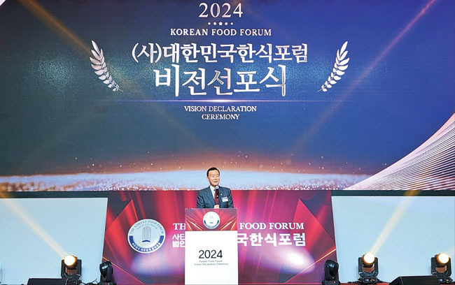 홍문표(사진) 한국농수산식품유통공사(aT) 사장은 23일 서울 서초구 더케이호텔서울에서 개최된 ‘2024 대한민국한식포럼 비전선포식’에 참석해 축사를 하고, 한식명장 등 현장 관계자들을 만나 대한민국 식품 영토를 확장하기 위한 K-푸드 수출 및 한식세계화 방안에 대해 논의했다.