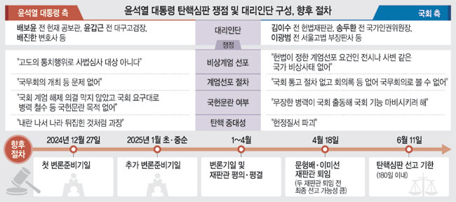 윤 대통령 측 참여로 탄핵소추안을 가결한 국회와의 법리 다툼이 본격화하면서 윤 대통령 탄핵심판이 속도전에 돌입할 것이라는 전망도 나온다. 앞서 헌재는 신속심리 방침을 밝히고 사건 검토에 착수한 바 있다. 노무현 전 대통령 탄핵심판은 선고까지 63일, 박근혜 전 대통령 탄핵심판은 92일이 각각 소요됐다.