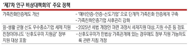 또, 정부는 가족친화인증제도를 재편해 ‘예비인증’-‘본인증’-‘선도기업’ 등 3가지 체계로 운영하기로 했다. 정부는 중소기업의 가족친화인증제도 참여를 유도하기 위해 ‘예비인증 제도’를 도입해, 예비인증을 받은 기업이 3년 내 ‘가족 친화인증’을 받도록 관련 컨설팅을 지원한다. 고광희 저고위 저출산정책국장은 “예비인증 선정 기업엔 고용노동부의 일·생활 구축비 지원과 중소기업 일자리 평가 가점 등의 혜택을 줄 예정”이라고 밝혔다. 또한, 12년 이상 가족친화인증 제도를 유지한 기업 중 우수기업을 ‘선도기업’으로 선정해 정기 근로감독 면제 혜택을 주는 등 추가적인 인센티브를 제공할 계획이다. 가족친화인증 주기를 기존 ‘신규(3년)→연장(2년)→재인증(3년)’에서 ‘신규(3년)→연장(3년)→재인증(3년)’으로 개편하고, 가족친화인증을 받은 중소기업에 대해 세무조사 및 관세조사 유예, 수출신용 보증료 할인 등 혜택을 제공한다.