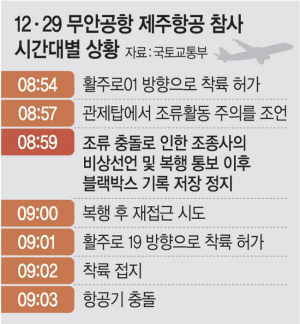 항공·철도사고조사위원회(사조위)는 13일 오후 비행기록장치(FDR)와 음성기록장치(CVR) 분석차 미국으로 파견 간 우리 측 조사관 2명이 귀국한다고 밝혔다. 다만, 사조위 측은 이들이 귀국해도 참사 원인이 파악되기는 시간이 소요될 전망이다. 블랙박스에서 원인을 규명할 가장 중요한 자료인 충돌 직전 4분이 CVR과 FDR 모두 저장 중단된 것으로 확인된 것이다. 앞서 기체는 오전 8시 59분 ‘메이데이’와 ‘버드 스트라이크’를 외친 뒤 반대방향 활주로로 9시 2분 동체착륙하고 9시 3분 로컬라이저 둔덕에 충돌했는데, 사고의 핵심을 밝힐 이 4분이 지워져 무슨 일이 일어났는지 즉시 파악하기 어려운 상황이다.