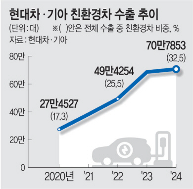 현대차·기아는 지난해 수출 실적을 잠정 집계한 결과 하이브리드차와 전기차 등 친환경차 수출이 전년(68만7420대) 대비 3% 증가한 70만7853대를 기록했다고 14일 밝혔다. 이는 이전 최다인 2023년 수출 실적을 넘어선 것으로, 전체 수출에서 친환경차가 차지하는 비중도 2020년 17.3%에서 지난해 32.5%까지 확대됐다.