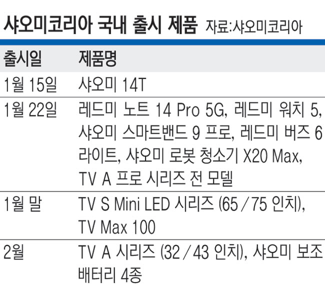 샤오미코리아는 이날 오전 서울 종로구 포시즌스 호텔에서 기자간담회를 열고 온라인 몰에서 스마트폰 2종과 TV 4종, 스마트 시계 1종, 무선 이어폰 1종, 보조 배터리 4종, 로봇 청소기 1종을 이날부터 다음 달 초까지 순차 출시한다고 밝혔다. 샤오미는 공식 온라인 스토어, 네이버 브랜드 스토어, 쿠팡 등 온라인에서부터 영토를 넓혀나간다는 계획이다. 조만간 서울에 자체 오프라인 매장 ‘미스토어’ 1호점도 열 방침이다. 조니 우 샤오미코리아 사장은 “한국은 혁신적인 기술과 제품을 빠르게 수용하는 시장으로, 샤오미에 중요한 의미를 가진다”며 “서비스, AS 등 모든 면에서 기대에 부응하도록 하겠다”고 밝혔다.