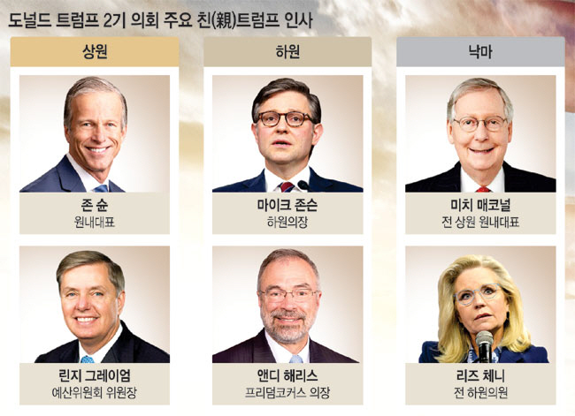 ◇사라진 반트럼프 인사들 = 상·하원을 막론하고 반트럼프 인사들은 2022년과 2024년 선거를 거치며 힘이 크게 약화됐다. 1985년부터 상원의원을 지낸 미치 매코널은 지난해 11월 상원 원내대표직에서 물러났다. 트럼프 1기 때는 친트럼프 인사였던 그는 2020년 대선 패배 과정에서 트럼프 당선인 눈 밖에 났다. 또 다른 대표적 반트럼프 거물 정치인 밋 롬니 전 의원도 지난해 정계 은퇴를 선언했다. 하원에서는 트럼프 1기 때 탄핵안에 찬성했던 10명 의원의 행보가 상징적이다. 2022년 선거에서 10명 중 4명은 아예 당내 경선에 나서지도 못했고, 대표적인 반트럼프 인사인 리즈 체니 전 의원을 비롯한 4명은 경선에서 친트럼프 당원들의 압도적인 ‘비토’로 패했다. 데이비드 발라다오, 댄 뉴하우스 두 명의 의원만 2022년에 이어 2024년에도 승리하며 하원 의회에 입성했다. 더힐은 “트럼프의 대선 승리는 반트럼프 당원들에게 가장 따끔한 질책”이라며 “의회와 공화당 내에서 트럼프에게 회의적인 목소리는 더욱 줄어들게 됐다”고 보도했다.