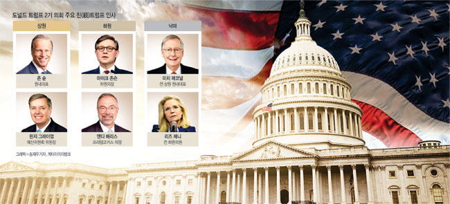 ◇원심력 강하지만 친트럼프 인사 힘 막강한 상원 = 53대 47로 다수당의 지위를 차지하고 있는 상원은 대통령(4년)보다 긴 임기(6년)와 상대적으로 소수(100명)인 규모로 하원보다는 의원 개개인의 독립성이 강하다. 그만큼 트럼프 당선인의 ‘그립’이 약하고 원심력이 세다. 당장 상원 원내대표 선거에서도 일론 머스크 테슬라 CEO가 밀던 후보가 1차 경선에서 탈락하고 존 슌 의원이 당선되는가 하면, 트럼프 당선인이 임기가 보장된 연방수사국(FBI) 수장을 교체하자 한 의원이 공개적으로 반대 의견을 낼 정도다. 하지만 트럼프 당선인의 골프친구인 린지 그레이엄 예산위원회 위원장 등 친트럼프 인사들의 힘은 여전히 막강하다는 평가를 받고 있다.