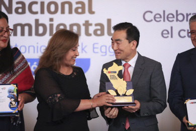 현지 방송사들이 시상식을 생중계하는 가운데 볼루아르테 대통령은 “여러분의 창의적인 노력과 헌신은 지속 가능한 발전, 빈곤 퇴치 그리고 지구 보호라는 공동의 목표를 이루는 데 중요한 기여를 하고 있다”고 했다. 이번 수상과 관련, 하나님의 교회 총회장 김주철 목사는 “우리 교회는 앞으로도 지구 환경을 보호해 더 나은 세상을 만들어 가는 데 솔선하겠다”고 밝혔다. 사진은 볼루아르테(왼쪽) 페루 대통령이 ‘페루포셋 하나님의 교회’ 김왕현(오른쪽) 목사에게 상패를 수여하는 모습.