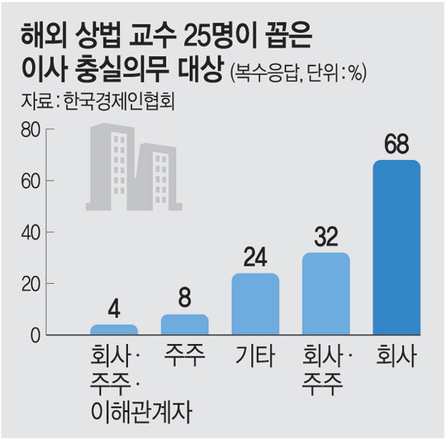한국경제인협회(한경협)는 한국경영인학회에 의뢰해 영국 케임브리지대·미국 코넬대·일본 히토쓰바시대 등 해외 주요 로스쿨 교수 25명을 대상으로 설문을 진행, 이 같은 결과가 나타났다고 20일 밝혔다. 조사에 따르면 로스쿨 소재 국가의 이사 충실의무 대상이 누구인지 묻는 질의에 ‘회사’라고 응답한 비율이 68%로 가장 많았다. ‘회사와 주주’라는 답변율이 32%로 2위를 차지했고 ‘주주’(8%), ‘회사·주주·이해관계자’(4%) 순으로 뒤를 이었다. 한경협은 이에 대해 “이사의 충실의무 대상이 회사라는 것이 글로벌 스탠더드로 드러났다”고 평가했다.