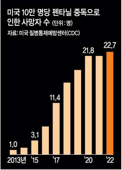 ◇마약 투약 및 강력범죄 증가로 악순환 = 범죄조직이 급성장하고 국제화하면서 마약 사용 등 전 세계에서 일어나는 범죄 역시 증가하고 있다. 유엔마약범죄사무소에 따르면 2022년 기준 전 세계에서 마약을 사용하는 인구수는 총 2억9200만 명으로 집계됐다. 이는 10년 전보다 20% 증가한 수치다. 마약 사용률의 경우 2022년 대마초가 4.41%로 가장 높았으며 아편과 펜타닐 등 각종 마약성 진통제(오피오이드)의 사용률은 1.15%였다. 필로폰 등 암페타민 계열의 마약류는 0.58%, 코카인은 0.45%, 엑스터시는 0.39%의 사용률을 보였다. 유엔마약범죄사무소는 특히 펜타닐 등 합성 마약의 사용과 중독이 크게 늘고 있다고 지적했다. 실제 미국 질병통제예방센터(CDC)에 따르면 미국 내 펜타닐 중독으로 인한 사망자 수는 지난 2013년 10만 명당 1명에 불과했으나 2022년 22.7명으로 이 기간 2000% 이상 증가했다.