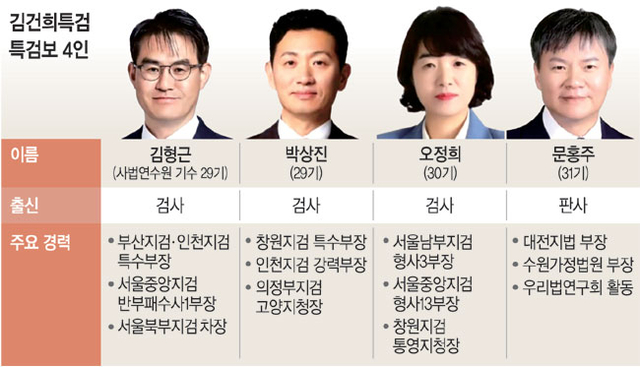 18일 김건희 특검을 책임진 민중기 특별검사는 “대통령실로부터 김형근·박상진·문홍주·오정희 등 특검보 4인의 임명통지를 받았다”고 밝혔다. 특수통으로 분류되는 김 특검보를 비롯해 박 특검보와 오 특검보 등 3명은 검찰 출신, 문 특검보는 부장판사 출신이다. 특검보 4명은 이날 오전 “이 사건이 지닌 공적 의미와 국민적 관심의 무게를 엄중히 인식하고 있다”는 내용의 임명 소감을 밝혔다. 이들은 “정치적 고려나 외부 압력에 흔들림 없이, 법률가로서의 소명과 직무의 독립을 지켜나가겠다. 실체적 진실규명을 위해 공정하고 투명하고 철저한 수사로 답하겠다”고 덧붙였다.