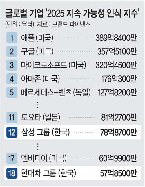 국내 브랜드 중 두 번째로 높은 SPV를 달성한 곳은 현대차인 것으로 나타났다. 57억8500만 달러로 18위를 기록했다. 기아(14억1600만 달러)까지 합치면 약 72억100만 달러에 달했다. 애플의 지속 가능성 인식 가치는 389억8400만 달러로 전 세계 브랜드 중 최정상을 유지했다.