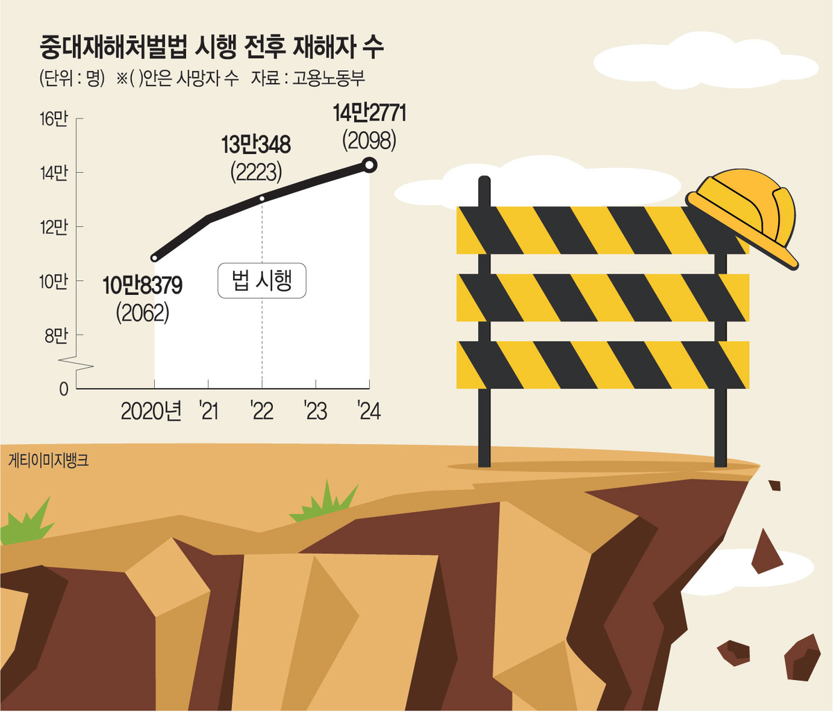 중처법 효과는 이미 한계를 드러내고 있다는 평가다. 고용노동부 등에 따르면 업무상 사고·질병 등을 합친 산업 현장 재해자 수는 2022년 중대재해처벌법 시행 전후로 지속해서 늘고 있다. 법 통과 직전인 2020년 10만8379명이었던 재해자 수는 유예기간이던 2021년 12만2713명으로 증가했다. 법이 시행된 2022년에는 13만348명, 2023년에는 13만6796명이었고 지난해(14만2771명)에는 14만 명을 넘겼다.