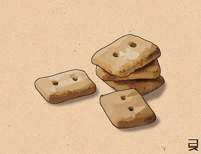 건빵의 다른 이름인 ‘십스 비스킷(ship’s biscuit)’은 그나마 봐줄 만한데 ‘하드택(hardtack)’에 이르게 되면 오로지 단단한 것만 강조된다. 그 결과 서양에서는 판금 비스킷, 이빨 파괴자, 철판 크래커라는 별명이 붙었고 우리는 벽돌로 부르기도 한다. 건빵에 대한 미움은 맛이 없고 딱딱한 데서 비롯된 것이긴 하지만 비정상적인 상황에서 배를 채우기 위해 억지로 먹어야 하는 음식이기 때문이기도 하다. 그래도 과자는 간식이고 빵은 주식에 가까우니 건과자보다는 건빵이 나아 보인다.