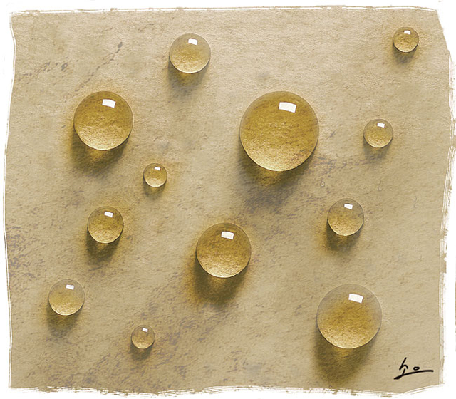 또 어느 땐가 김창열은 이렇게 말한 적이 있다. 물방울은 정화수, 동자승의 오줌, 예수가 제자의 발을 닦아주는 물이라고. 무언가를 향한 간절한 염원과 숭고한 사랑이 모여 응결한 결정체가 물방울이라는 것이다. 말하자면 구멍을 뚫고 나온 끈적끈적한 액체가 결국 말간 물방울로 정화된 것이다. 김창열은 내면의 고통과 불안을 잊기 위해 맑고 영롱한 물방울의 찰나적 아름다움에 집착했다.