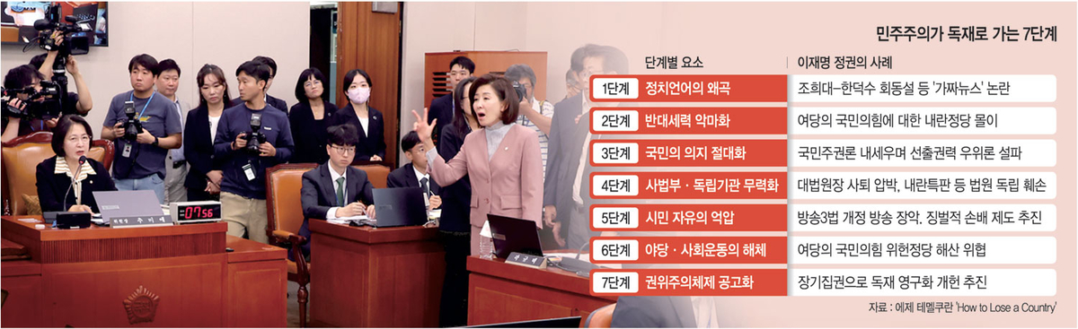 터키의 저널리스트 에제 테멜쿠란은 자신의 책 ‘How to Lose a Country’에서 민주주의가 독재로 가는 7단계를 제시했다. 정치언어의 왜곡(1단계)-정치적 반대 세력의 악마화(2단계)-‘국민의 의지’ 절대화(3단계)-사법부와 독립기관의 무력화(4단계)-표현의 자유 등 시민 자유의 억압(5단계)-야당과 사회운동의 해체(6단계)-권위주의 체제 공고화(7단계) 등이다. 한국은 테멜쿠란의 7단계 중 5단계까지 이른 상태로 진단할 수 있다.
