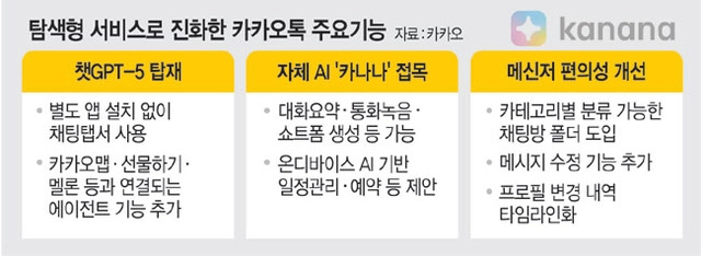 카톡 출시 15주년을 맞아 대대적으로 손질된 이번 개편의 가장 큰 특징은 오픈AI와의 협업으로 오는 10월부터 별도 앱 설치 없이 카톡 채팅탭에서 곧바로 최신 모델인 챗GPT-5 사용이 가능해진다. 이용자들이 대화 속에서 챗GPT로 검색한 내용을 곧바로 공유할 수 있다. 또 별도 앱 전환 및 탐색 없이 선물하기, 카카오맵, 예약하기, 멜론 등과 연계해 사용할 수도 있다.
