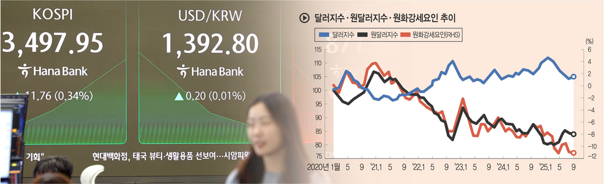 2025년 8월 달러화지수는 104.9로 2020년 1월 대비 그 가치가 4.9% 상승에 불과했지만 같은 기간 원·달러지수는 84.1이었고, 달러화 대비 원화가치는 15.9% 하락했다. 원·달러환율로 재해석하면 15.9% 상승한 원·달러환율 가운데 4.9%는 달러화 강세, 나머지 11%는 원화 약세에 따른 것이다.