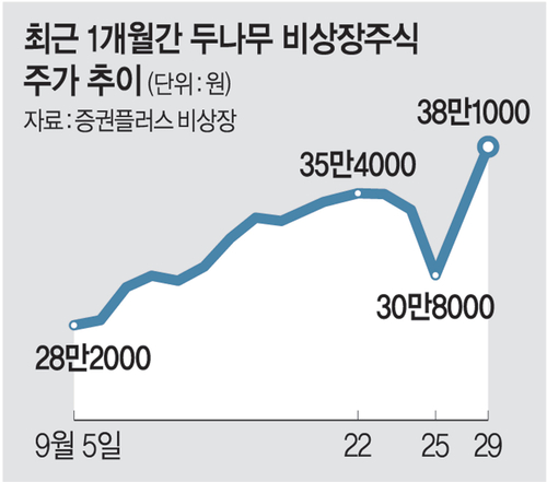 합병 기대감은 곧바로 주가에 반영됐다. 증권플러스 비상장에 따르면 비상장사인 두나무 주가는 전날 장중 40만5000원까지 치솟으며, 2022년 4월 22일(40만7000원) 이후 3년 5개월 만에 최고가를 기록했다. 두나무 주가는 네이버 자회사 편입 계획이 알려진 지난 25일 30만 원 초반대까지 떨어졌다가 이튿날 급반등한 뒤 상승세를 타고 있다.