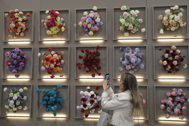 1일 콜롬비아 보고타에서 열린 프로플로라 무역박람회에서 한 관람객이 벽에 걸린 꽃들을 촬영하고 있다.