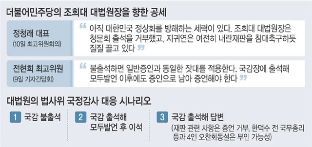 조 대법원장을 일반증인으로 채택한 민주당은 불출석 시 동행명령이나 고발 가능성까지 거론했다. 전 최고위원은 전날(9일) “불출석 시 일반 증인과 마찬가지로 국회법에 따른 절차를 충실히 이행하겠다”고 했다.